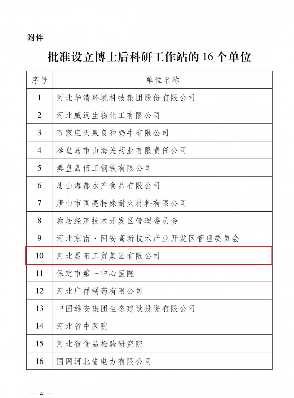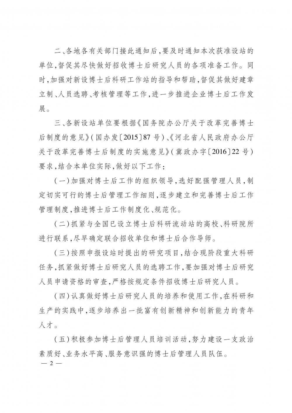 此次河(hé)北省被批準設立博士後科研(yán)工作(zuò)站的16個單位分別為河(hé)北華清環境(jìng)科技集團股份有限公司、河北威遠生物化(huà)工有限公司、石家莊天泉良種奶牛有限公司、秦皇島(dǎo)市山海關藥業有限責任公司、秦皇島佰工鋼鐵有限公司、唐山海都水產食品有限公司、唐(táng)山市國亮特殊耐火(huǒ)材料有限公司、廊坊經濟技術開發區管理委員會、河北京南·固安高新技術產業開發區管理委員會、河北(běi)晨陽工(gōng)貿集團有(yǒu)限公司、保定市第一中心醫院、河北廣祥製藥有限公(gōng)司、中(zhōng)國雄安集團生態建設投資有限公司、河北省中醫院、河北省食品檢驗研究院、國網河北省電力(lì)有限公司。
