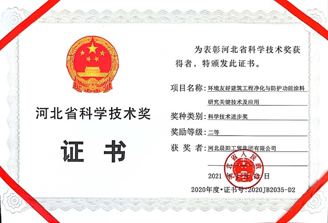 河北晨陽工(gōng)貿集團有限公司《環境友好建築工程淨化與防護功能(néng)塗料研究關鍵技術及應用》項目榮獲河北省科學技術進步獎二等獎。近年來,河(hé)北晨陽工貿憑借高質量創新成果的落地驗證和迭(dié)代升級(jí),已多(duō)次獲得該項殊榮。