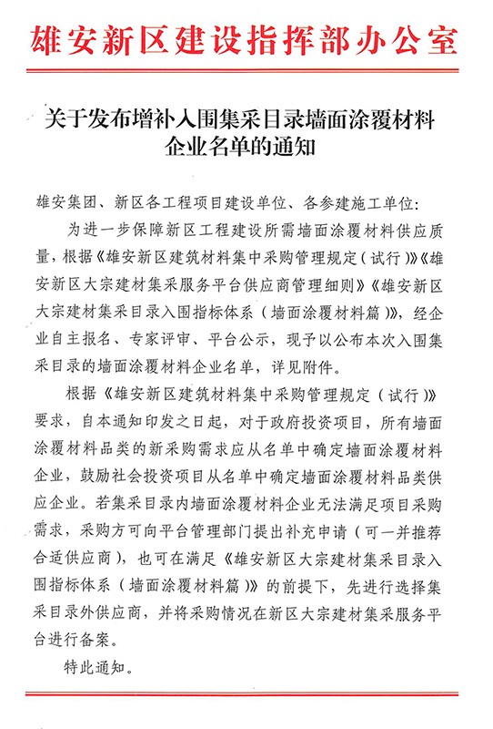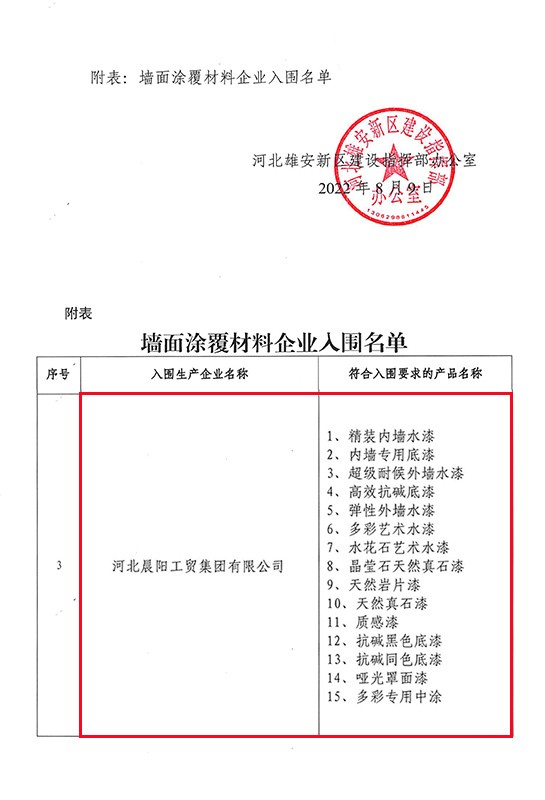 2022年8月9日,雄安新區建設指揮部辦(bàn)公室發布了《關(guān)於發布增補入圍集采目(mù)錄牆麵(miàn)塗覆材料企業名單的通知》。據牆麵塗覆材料企業入(rù)圍(wéi)名單顯示:河北晨陽(yáng)工(gōng)貿集團有限公司(以下(xià)簡稱“晨陽(yáng)水漆”)共計(jì)有15款內外牆環保水漆產品入選。
